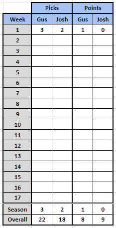 Week 1 is always a crap shoot and that is why instead of taking on the burden myself, I put it on Josh. I will not let Josh skate by this season on the coattails of my own mistakes. That is how you play the man, not the odds.