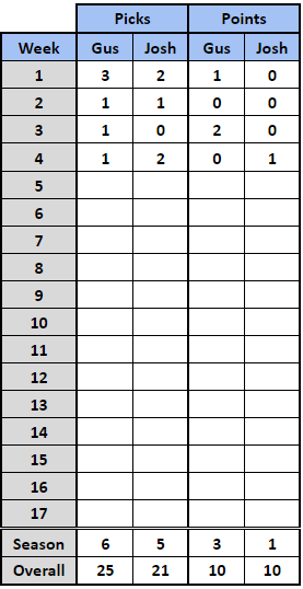 My big Miami handicap fell apart late unfortunately. With 5 and a half minutes to play down by 9 with the ball (a great position to cover the 6.5 against a soft Seattle defense) Fitzpatrick threw a costly interception which immediately led to a Seattle touchdown and ended any chance at the cover. My read on Cincinnati was solid, predicting the rookie would pulled out his first win, setting up perfectly for Buffalo to make Josh regret breaking his golden rule. However Vegas fell flat in second half and couldn’t keep up with the Bills, giving Josh his first W of the year.