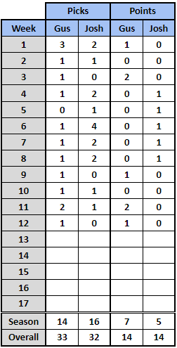 NOW WE COOKIN! This season has been the story of streaks with myself taking a 3-0 lead to start the season followed by Josh rattling off 5 in a row and now I have regained the lead with 4 points in a row. With 5 points remaining up for grabs all I need to do is win 2 and I will secure the victory. This week will be a big one, lets get to work.