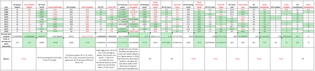 Now the key takeaway from the above is that Forte and AP were very similar players in yards per season, yards per game, and yards per touch. No surprises, they were high volume work horses. It is at this point, I reveal the twist.