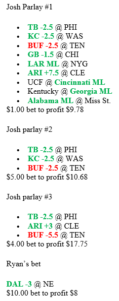 Recap: Fuck the Bills and despite Ryan’s wishes, Josh did not change his ways. Just a reminder, this is the THIRD week that a single leg busted all parlays (6 total parlays busted (Alabama and Steelers responsible for the other busts)). Those are the unfortunate swings. FUCK THE BILLS. Adding insult to injury, the Cowboys beat the Patriots in a thriller for Ryan to cash in. Had the Bills not sucked, this would be a $10 competition. My ways will not change, but I will be placing a side bet on the Bills ML for the rest of the season. If I lose, so shall the Bills.
