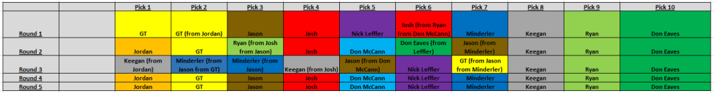 Below is the draft order. Let me know if you see any issues with the trades/picks you think you should have. I also included my draft pick tracker from this year to help make it simpler.
